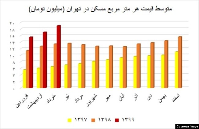 متوسط قیمت مسکن در خرداد ماه از ۱۹ میلیون تومان برای هر متر مربع فراتر رفته است. این رقم در اردیبهشت امسال ۱۷ میلیون تومان و در فروردین ماه ۱۵.۵ میلیون تومان بود. قیمت مسکن در ایران از ابتدای سال ۹۷ چهار برابر شده است.
